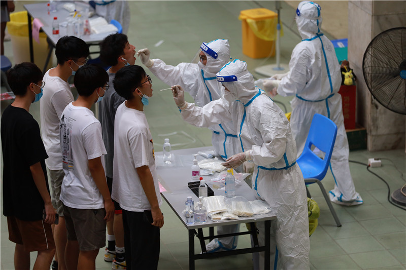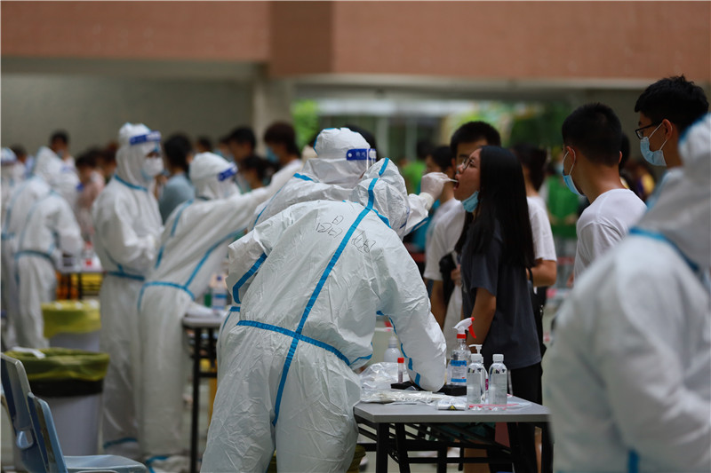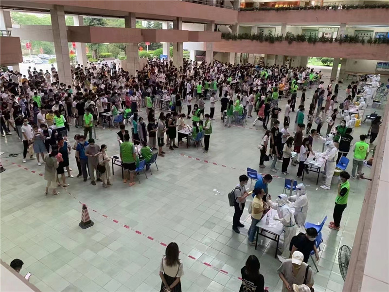 面对广东省新型冠状病毒肺炎疫情出现的新情况,学校高度重视,迅速行动,按照省委省政府、市委市政府工作要求,响应东莞市开展全员核酸检测安排,在从严、从实、从快启动应急响应机制的基础上,对全校核酸检测工作做出周密部署。当天下午东莞市莞城医院医疗队进入3044AM永利集团为全体师生进行核酸检测,共设置7个检测点,其中包含6个学生检测点和1个教职员工检测点。检测现场,全体师生根据事先安排的时间到达核酸检测采样现场,分十人一组,按照防疫要求保持安全间隔距离依次进行采样。现场实行单口进入、单口离开,人员不交叉,采样结束后师生迅速离开现场。