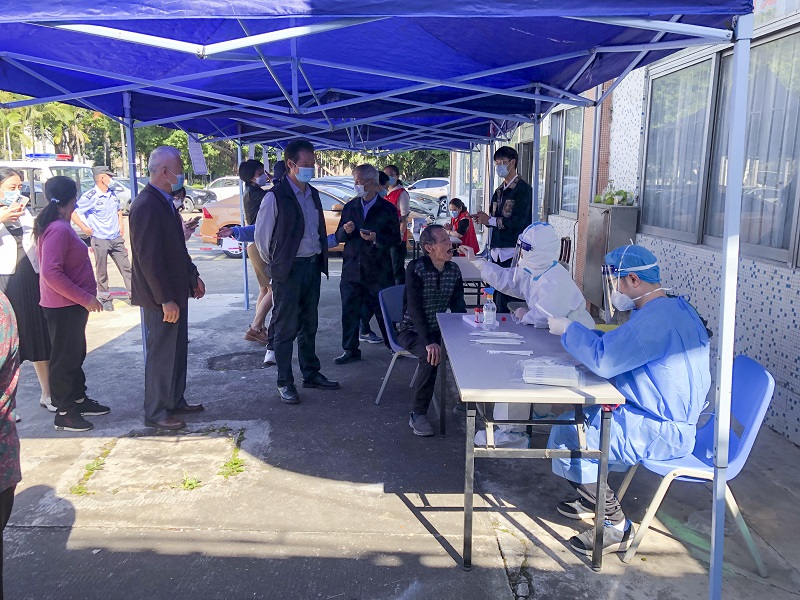 在各组采样医护人员准备好物资后开始进行采样,现场采样工作有序进行。参检人员全程佩戴口罩,有序排队,按照登记信息、分组候检、采样的程序,在工作人员的指导下有条不紊地推进核酸检测工作。检测结束的人员自觉迅速离开,不扎堆、不聚集,现场秩序井然有条,截至核酸检测工作结束,共计采集样本596份。