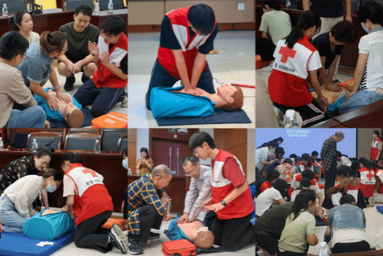 本次讲座分为急救理论知识和实践操作两个环节,在两校区吸引了超100人报名参加。主讲老师先通过PPT图文声并茂展现心肺复苏的基本常识和方法,把应急救护的相关知识和技能传授给莞工教职员工。然后到实操环节,广医团队准备了多个模型和 AED机器,志愿者先现场示范演练,随后,在主讲老师和志愿者的协助指导下大家分组进行模拟训练,在人体模型上操作了人工呼吸、心肺复苏和使用AED,让参与者能更好地掌握急救的基本操作要领。参会教职员工与志愿者积极互动,现场气氛非常活跃。