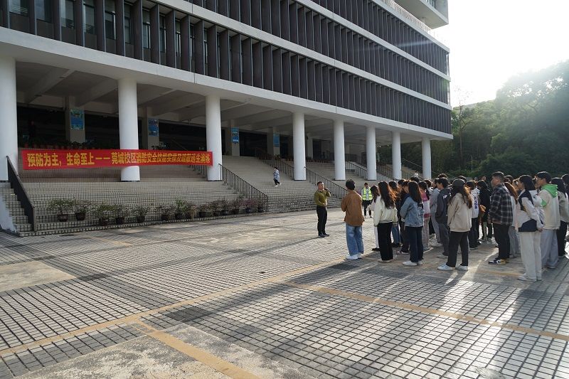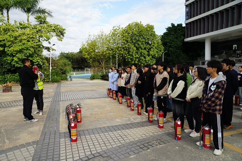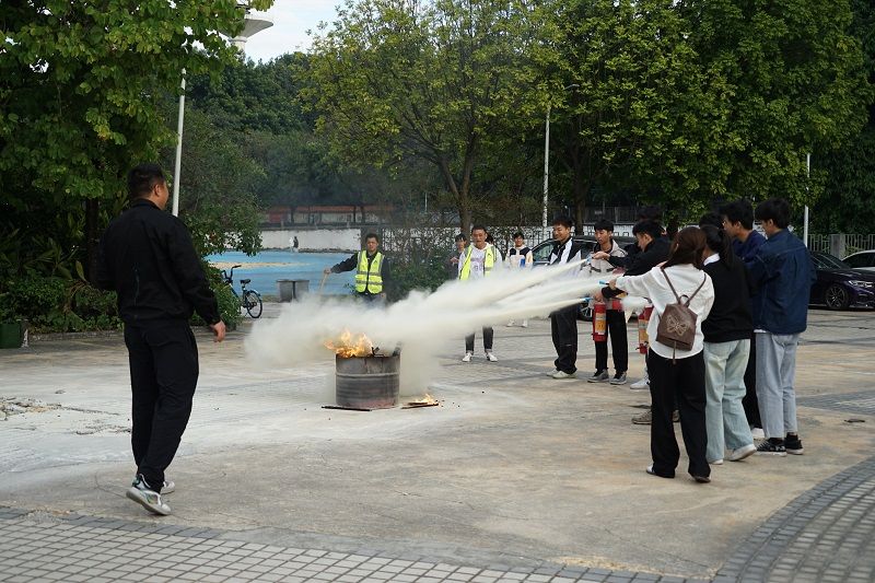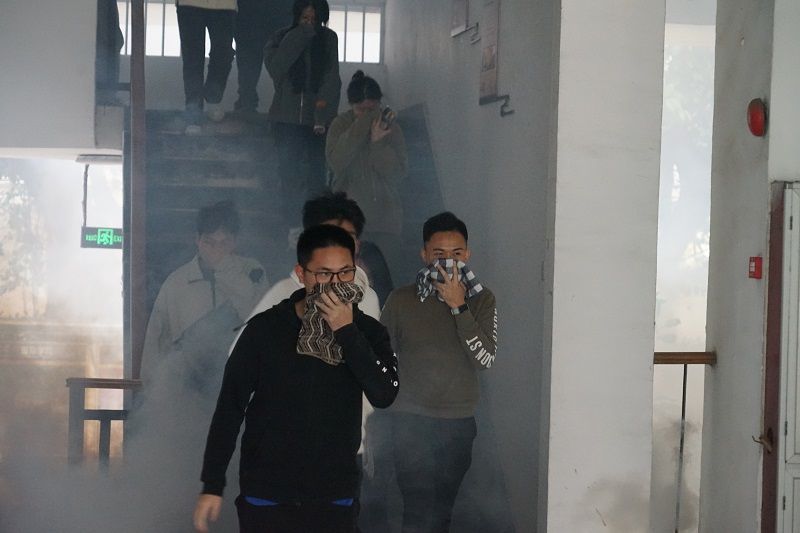 随着紧急的警报声响起,模拟火灾烟雾弹燃起,消防演练活动拉开了序幕。在图书信息大楼二楼的师生听见警报声后,在工作人员的指引带领下,用湿毛巾捂住口鼻,低姿势弯腰前行,有组织、有秩序、不慌乱地沿着指定线路撤离到安全地带。随后,在专业消防维保人员的指引下师生们实操了灭火器的使用。