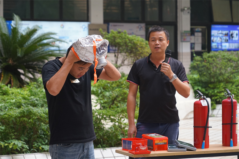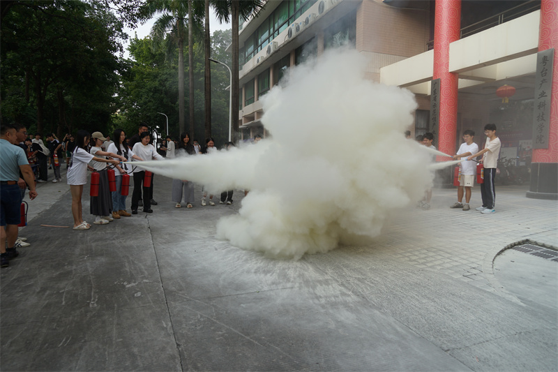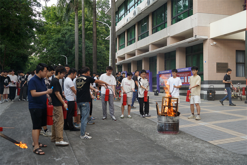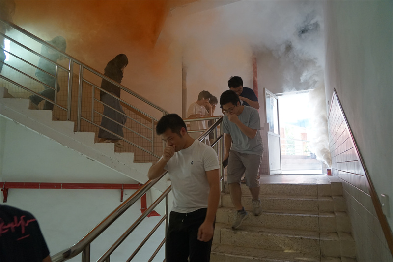 理论培训结束后,参加活动的师生在工作人员的指引下有条不紊地进行火灾逃生自救演练及灭火器使用实操。