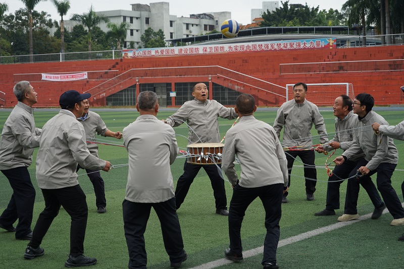 运动会现场设置了同心鼓击球、长杆跑、接力跳等趣味与协作并重的项目。同心鼓击球环节,队员们围站鼓周手牵绳线,目光紧盯鼓面排球,鼓点与击球声交织成欢快乐章,每一次成功击球都引来阵阵欢呼;长杆跑项目中,7名队员手抓同一根长杆同步向前奔跑,步伐整齐划一,展现出校卫队伍特有的纪律性与协作力;接力跳里,队员一人夹着3个篮球,跳跃前进时既要保持平衡又要保证球部掉落,滑稽又紧张的场景让现场笑声不断,现场气氛热烈而温馨。