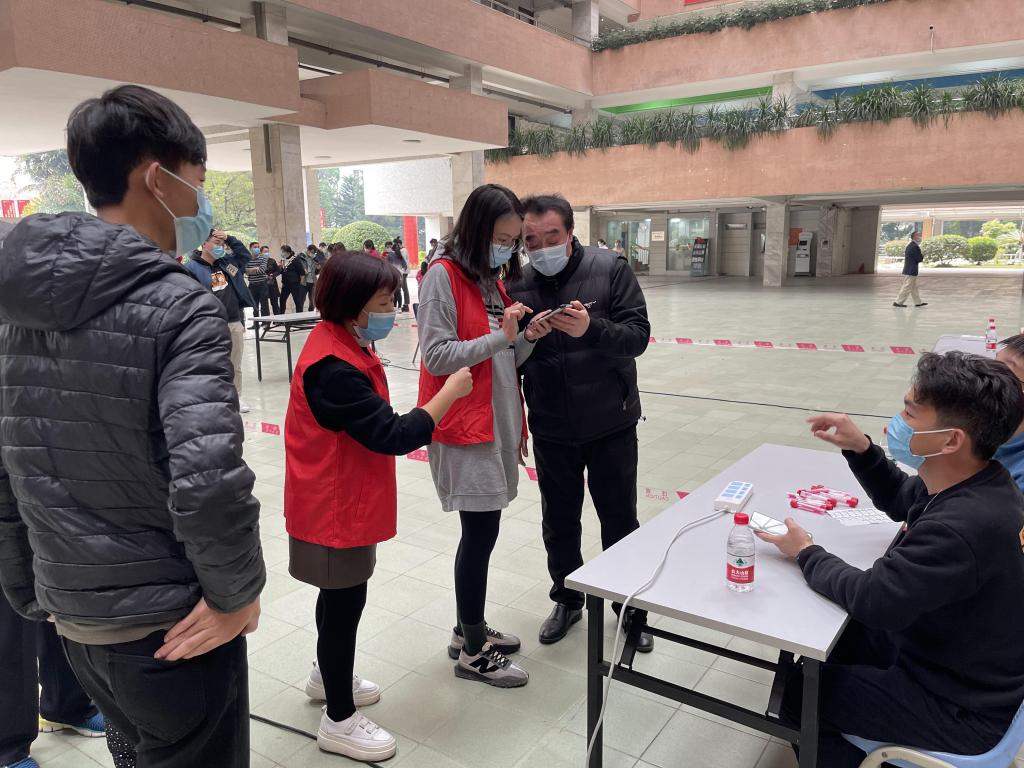 闻令而动、听令而行。全体党员、群众志愿者在接到通知后迅速完成核酸检测场地布置工作,配合校区内各职能部门准备各类物资,现场为校内师生、退休教职工核酸检测登记提供引导和帮助,不断提醒大家保持距离、戴好口罩并提前扫码登记个人信息,志愿者们尽己所能,全力服务师生。